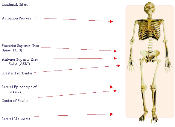 The Postural Digital Analysis Program is only as accurate as the person operating the program- and that includes landmarking the client. Enclosed with your software are 1 dozen Styrofoam balls, ideal for use as landmarks. We recommend a slightly darkened background for taking the photos, so the landmanrks are clearly visible when operating the program in your computer. You will need 2-sided tape (or other tape folded in half) to affix the landmarks to your client. It is recommended that you locate each landmark, affix the tape, then immediately affix the Styrofoam ball. While the landmarking is done with the client clothed, you may need to ask the client to remove their belt- it may make a difference when landmarking the ASIS and PSIS. Shorts are also preferred if possible, as that would make it easier to landmark the patella, greater trochanter and lateral epicondyle of the femur . Remember, we need to landmark bilaterally!